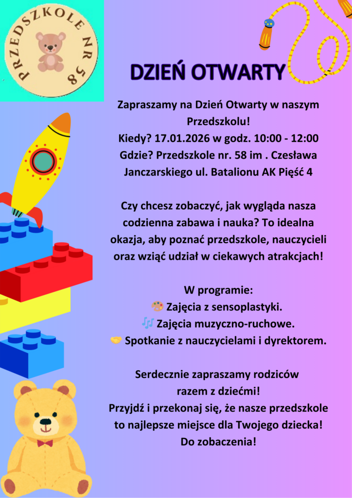 Serdecznie zapraszamy do naszego Przedszkola na otwartą sobotę dla dzieci rodziców, którzy będą uczestniczyli w rekrutacji do przedszkola na rok szkolny 2026/2027. Otwarta sobota odbędzie się 17 stycznia 2026r. w godzinach 10:00-12:00. Zachęcamy do zapoznania z naszym Przedszkolem 🙂